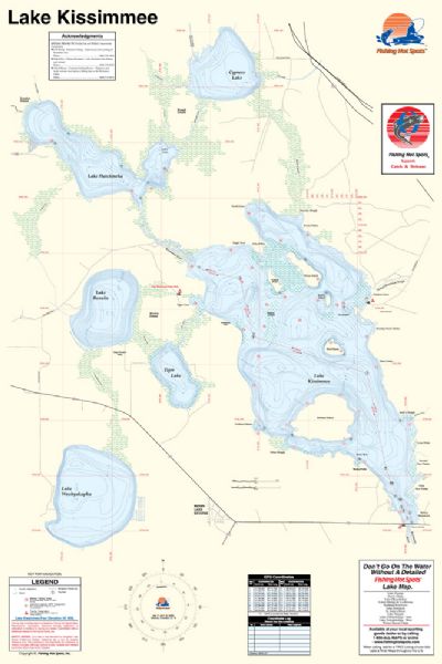 The 'anchor' of the Kissimmee chain of lakes, the most remote of Florida's 10 largest, highly acclaimed bass waters. This detailed map provides depth contours, structure, boat ramps and updated fishing information, with productive spots marked on the map. You'll also find a complete lat/long grid and dozens of GPS waypoints. These four-color maps are as easy-to-use as they are to read! Size - 24 x36